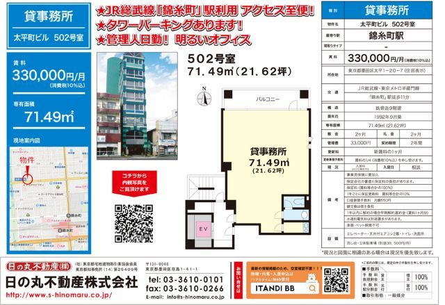 JR総武線・東京メトロ半蔵門線「錦糸町」駅から徒歩11分、太平町ビル502号室が募集開始となりました。